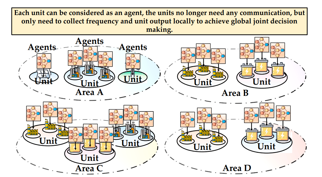 针对在基于性能的频率调节市场运行的互联电网中,因策略不协调和联络线功率波动导致运营商利益冲突加剧、频率波动频繁的问题,为提升电网稳定性,李嘉文副教授和崔昊杨教授及其团队创新性提出模仿鱿鱼分布式神经决策机制的鱿鱼启发协同负荷频率控制方法,将区域单元视为独立智能体,仅依赖本地信息实时决策以避免跨区通信延迟或错误;并引入采用混合课程学习策略的自动课程多智能体深度元演员-评论家算法,实现复杂随机电网中多目标多区域的高效协同学习与鲁棒控制;基于中国南方电网四区模型的仿真验证表明该方法能有效减少功率波动。其工程价值在于为多运营商互联电网提供了可规避通信瓶颈、有效协调利益冲突并显著抑制频率及联络线功率波动的实用化频率控制新方案,推进了智能电网稳定运行技术的发展。该成果以《Bionic cooperative load frequency control in interconnected grids: A multi-agent deep Meta reinforcement learning approach》为题发表于《Applied Energy(中科院一区,IF=10.1)