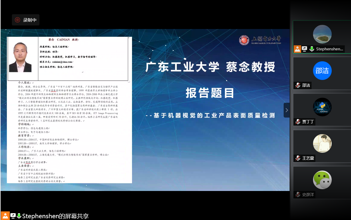 2020年925日下午,电力数据可视化团队沈文忠,邵洁,刘丹丹,赵倩等老师及多名研究生共同听取了广东工业大学蔡念教授题为“基于机器视觉的工业产品表面质量检测”的学术报告。