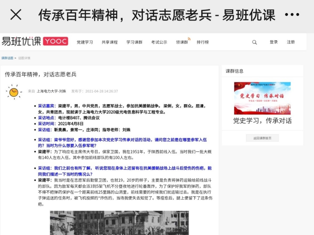 今年正值中国共产党百年华诞,为使广大师生深入学习党史,传承老党员的优秀品质。新葡萄8883官网amg官网深入挖掘师生身边的优秀党员榜样资源,通过学生与“老干部、老战士、老专家、老教师、老模范”的“五老”传承对话采访,并通过学院微信公众号与易班平台,带领广大师生走进优秀老党员可歌可泣的故事中,感悟奋斗精神,增强责任担当,把党的百年奋斗延伸向未来。