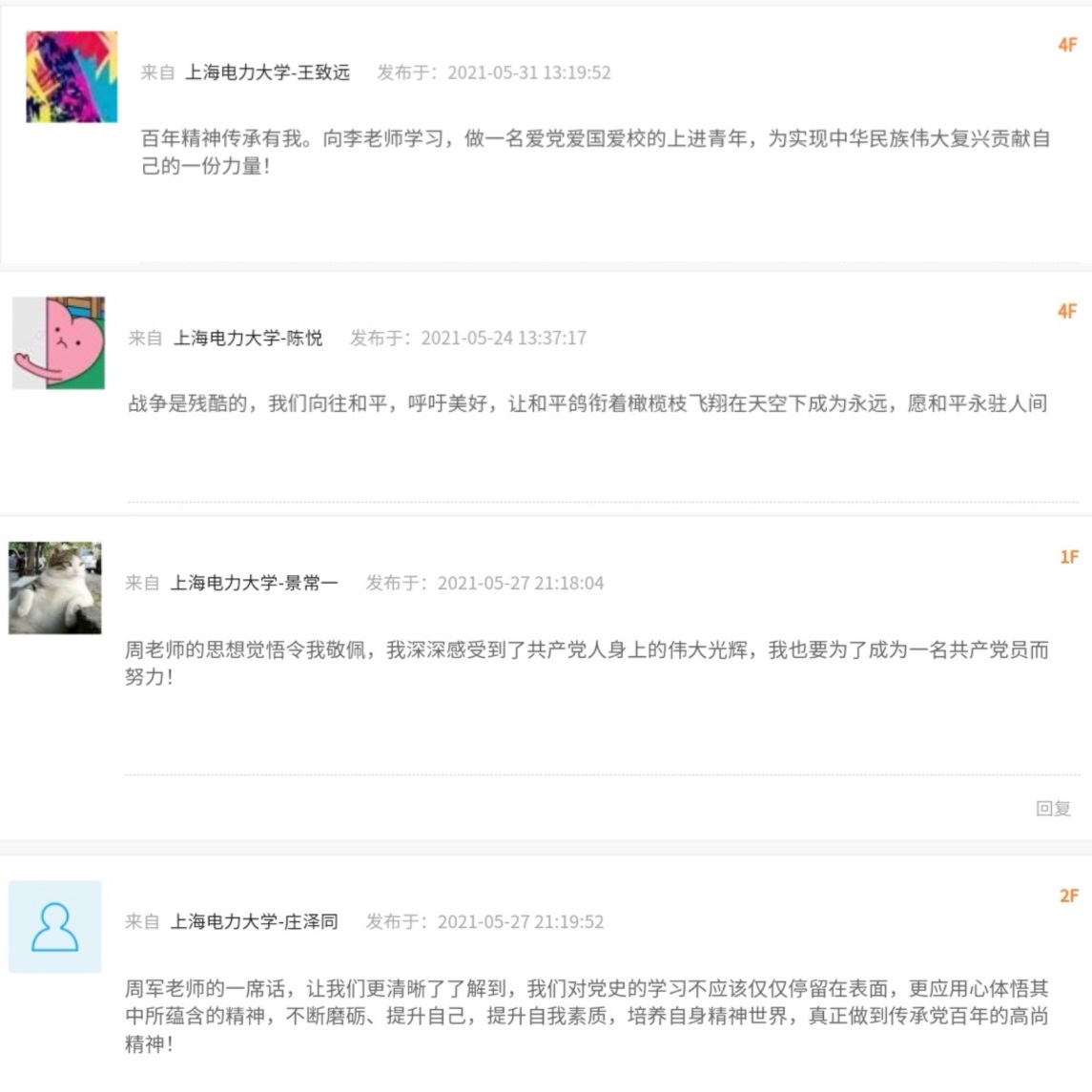 本次“党史学习,传承对话”活动,形式新颖,内容丰富,公众号与易班平台在发出后也收到了同学们的积极留言。同学们纷纷表示作为新时代的大学生,更应牢记革命先辈们用生命与热血书写下的百年党史,传承共产党员的优秀品质。下一步,新葡萄8883官网amg官网将继续围绕党史学习教育开展系列活动,培养学生党性底蕴,以优异成绩迎接建党一百周年!