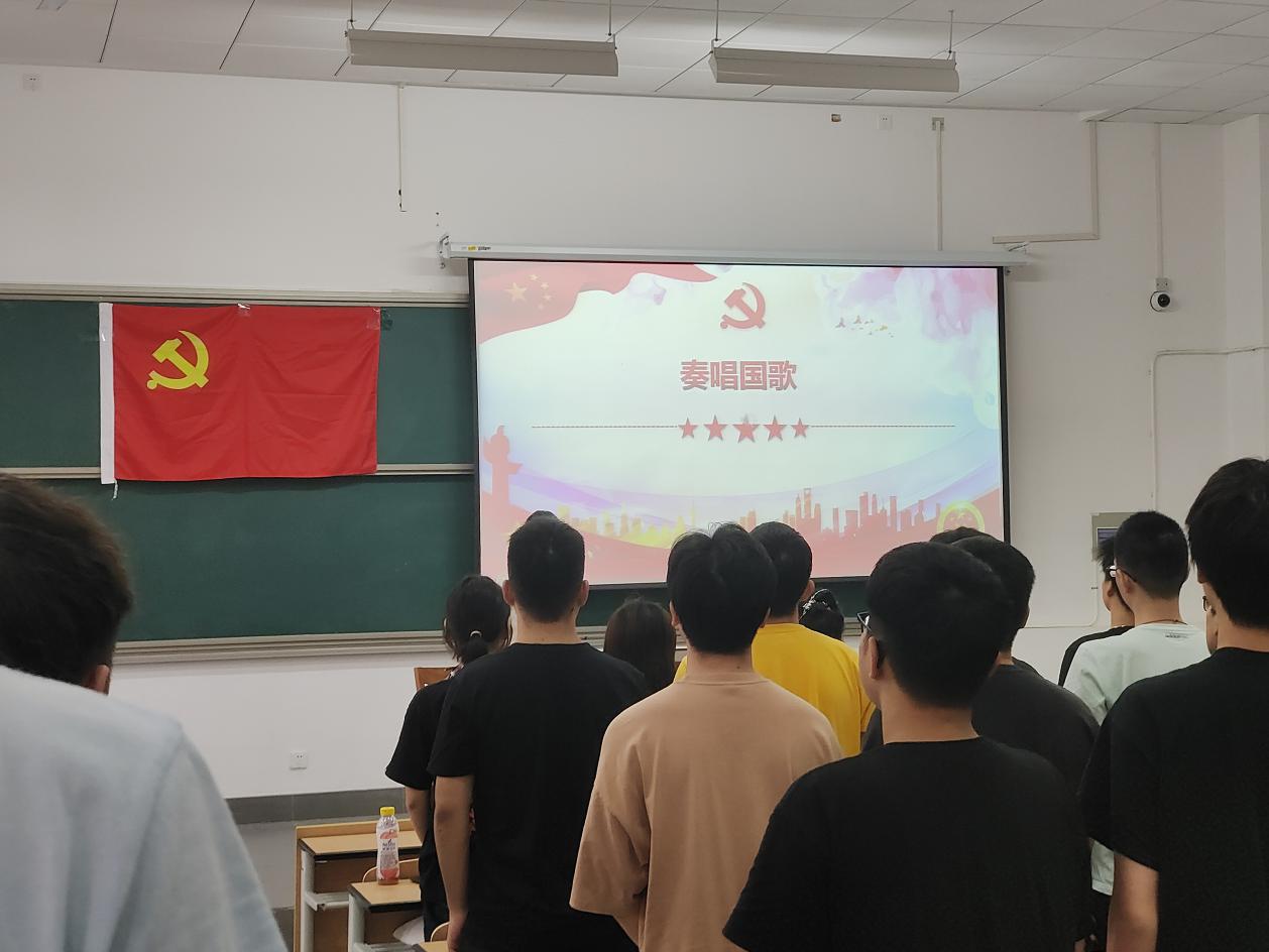 会议伊始,全体师生起立,奏唱中华人民共和国国歌。
