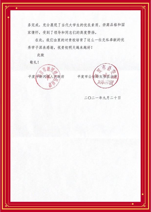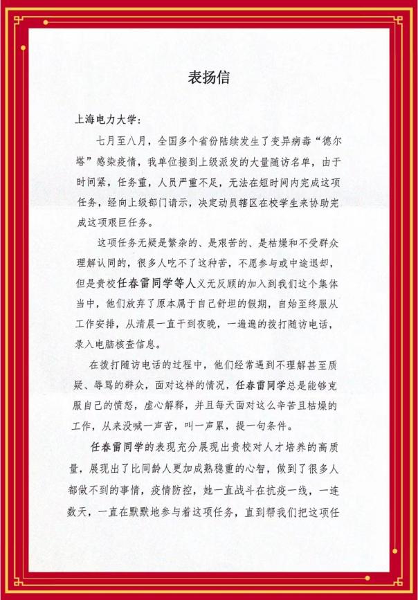 信中指出,今年暑期变异病毒“德尔塔”来势汹汹,平度市新河镇因靠近当时为“中风险地区”的烟台市,相关排查工作给当地疫情防控部门带来了不小的挑战。任春雷同学积极报名参与疫情防控志愿服务活动,放弃了舒适的假期,面对繁杂、艰苦、枯燥的工作和群众的不理解,都能耐心处理。任春雷同学负责电话随访、信息核查录入等工作,从清晨一直干到夜晚,一连数日,直到配合当地部门完成任务。任春雷同学以实际行动充分展现了当代大学生的优良素质、崇高品格、家国情怀和新葡萄8883官网amg官网人才培养的高质量,同时感谢学校对学生品德的精心培育。
