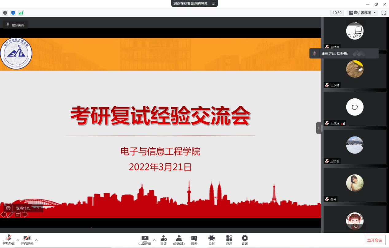 抗疫不停学,在这段特殊时期,为了使进入考研复试的同学掌握更多相关技巧,以良好的状态备战复试,新葡萄8883官网amg官网于3月21日晚上7:00举办了线上“考研复试经验交流会”。新葡萄8883官网amg官网党委副书记周冬梅、光电科学与信息工程专业教师薛亮、就业专项负责人黄燕、毕业班辅导员许晓天、崔释匀参会。会议还邀请了往届优秀学子进行分享。