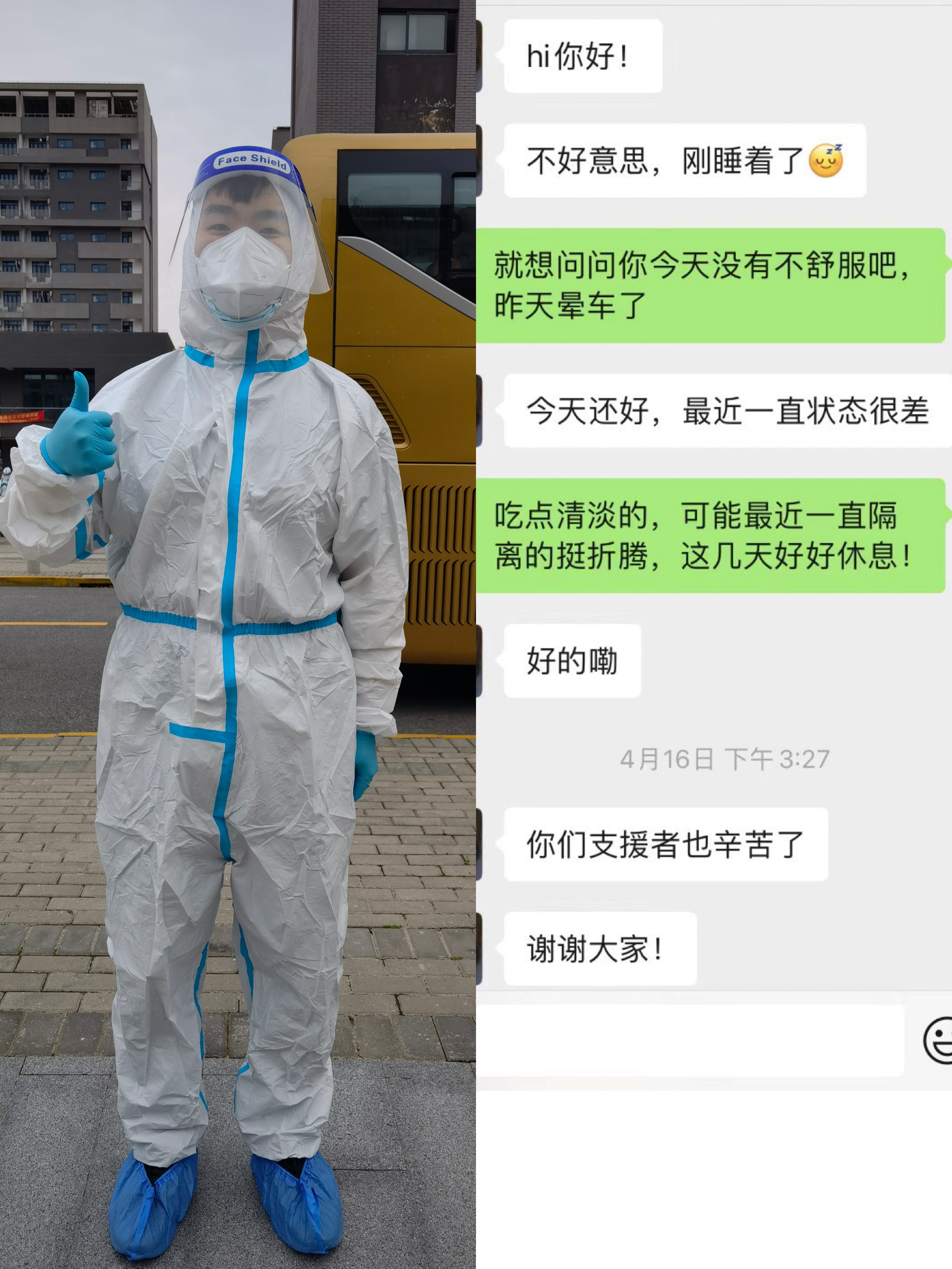 面对突如其来的疫情,杨志鹏一直奋战在校园抗疫一线,担任临港校区7号楼核酸检测志愿者。在接到此次带队任务时,他没有片刻犹豫,第一时间回到宿舍收拾好行李,做好护送同学前往隔离点的准备。此时的他已从一名学生党员转换为一名“学长老师”。在上海到南京的380公里路程中,杨志鹏密切关心关注每一位同学的思想和身体状况,做好同学们的思想安抚工作,叮嘱同学们不要担心,告诉大家学校会全程保障同学们的健康与安全,打消了转运同学的顾虑,使转运过程平稳有序。