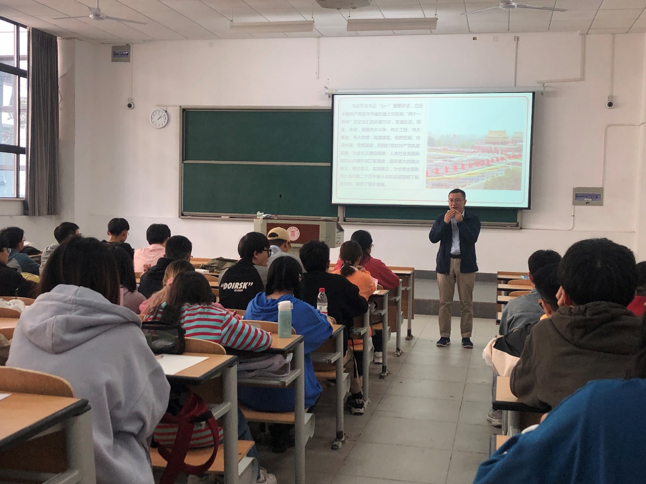 开班仪式之后,学员们前往三教106聆听了两场党课。第一场由马克思主义学院巩军伟老师带来主题为“学习习近平总书记‘七一’讲话精神”的党课,巩老师从习近平总书记“七一”讲话的各个方面给学员们深入剖析了其中的内涵,从党的成就、任务到第二个百年目标都做了细致的讲解。巩老师深入浅出地阐述了什么是伟大建党精神,号召广大青年要一代代把伟大建党精神传承下去、发扬光大。