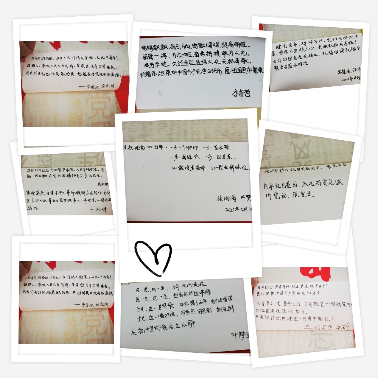 在100天的时间里,学院4个教工党支部和7个学生党支部的百余党员每天接力翻倒计时牌,深情书写对党的祝福,在一笔一画中彰显初心使命,将对党的忠诚与热爱之情融入字里行间,最终由100张祝福卡片汇聚成一面鲜红的党旗,向党的百岁生日献礼。活动中党员们纷纷抒发了自己的初心和祝福,许下不断前行奋进的誓言。