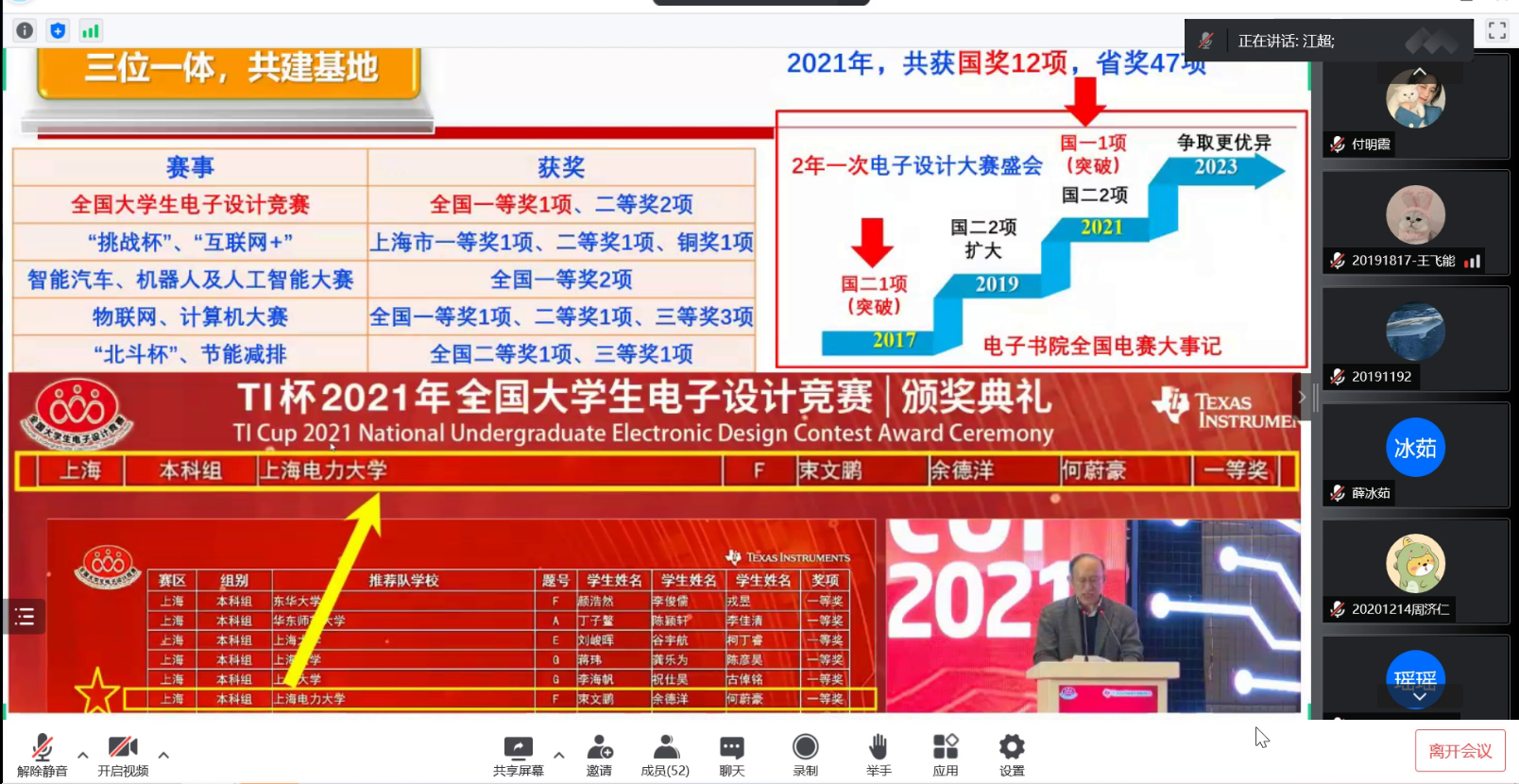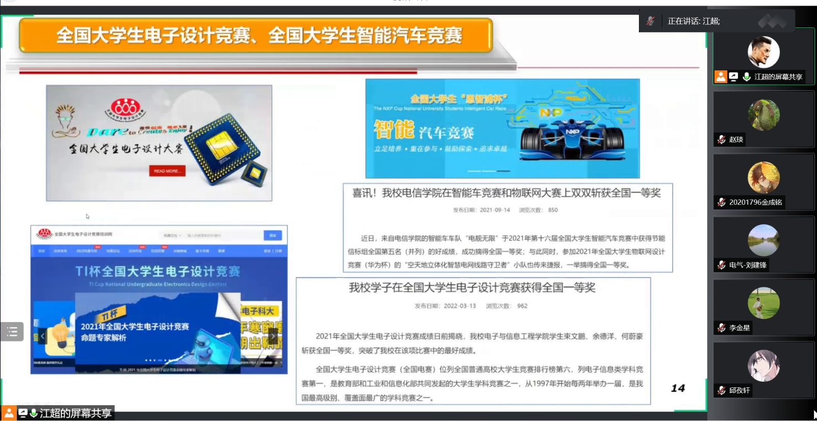 江超老师从专业、学科、工程教育认证的12条毕业要求以及“互联网+”大学生创新创业大赛切入主题,创新创业教育是一个系统性的工程,与教育教学相辅相成,同为一脉。解读了学院创新创业训练与实践学分管理办法以及本科生科研能力提升计划管理办法。详细介绍了新葡萄8883官网amg官网创新创业教育基地--电子书院-科创中心-电子学社一体化窗口建设,回顾了近年来学院在互联网+、挑战杯、电子设计竞赛、智能汽车竞赛等各类含金量颇高的赛事中的辛勤付出与收获。以及双创基地在社会服务方面做出的突出贡献:积极参加70周年校庆、招生宣传、校宣传片拍摄等活动;2次承办临港大学堂科创小英才新葡萄8883官网amg官网创客未来夏令营活动;2021年以来走出校园,科普宣讲十余场次,服务上千名中小学生。