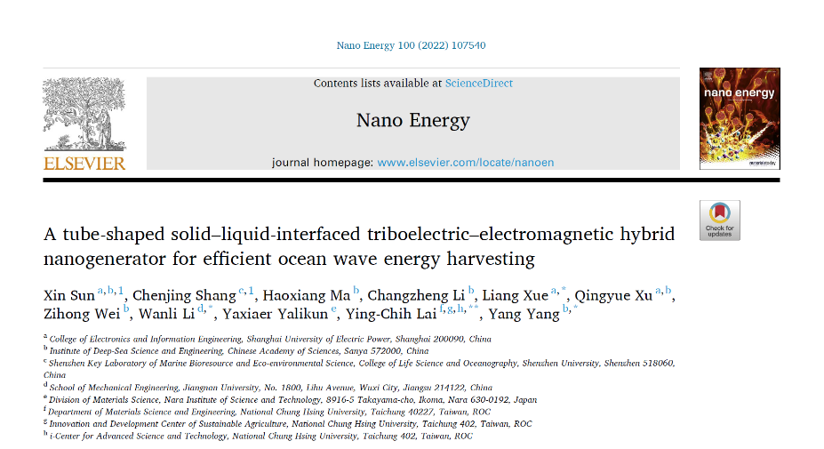 新葡萄amg官网薛亮老师与中国科学院深海所杨阳研究员团队、台湾中兴大学赖盈至教授团队等合作的研究成果于2022年6月在国际顶级期刊《Nano energy》(中科院SCI一区,IF:19.069)在线发表,论文题目“A Tube-Shaped Solid-Liquid Interfaced Triboelectric- Electromagnetic Hybrid Nanogenerator for Efficient Ocean Wave Energy Harvesting”。新葡萄amg官网2020级硕士生孙鑫同学是本文的第一作者,深圳大学尚琛晶是共同第一作者,第一单位为新葡萄8883官网amg官网。