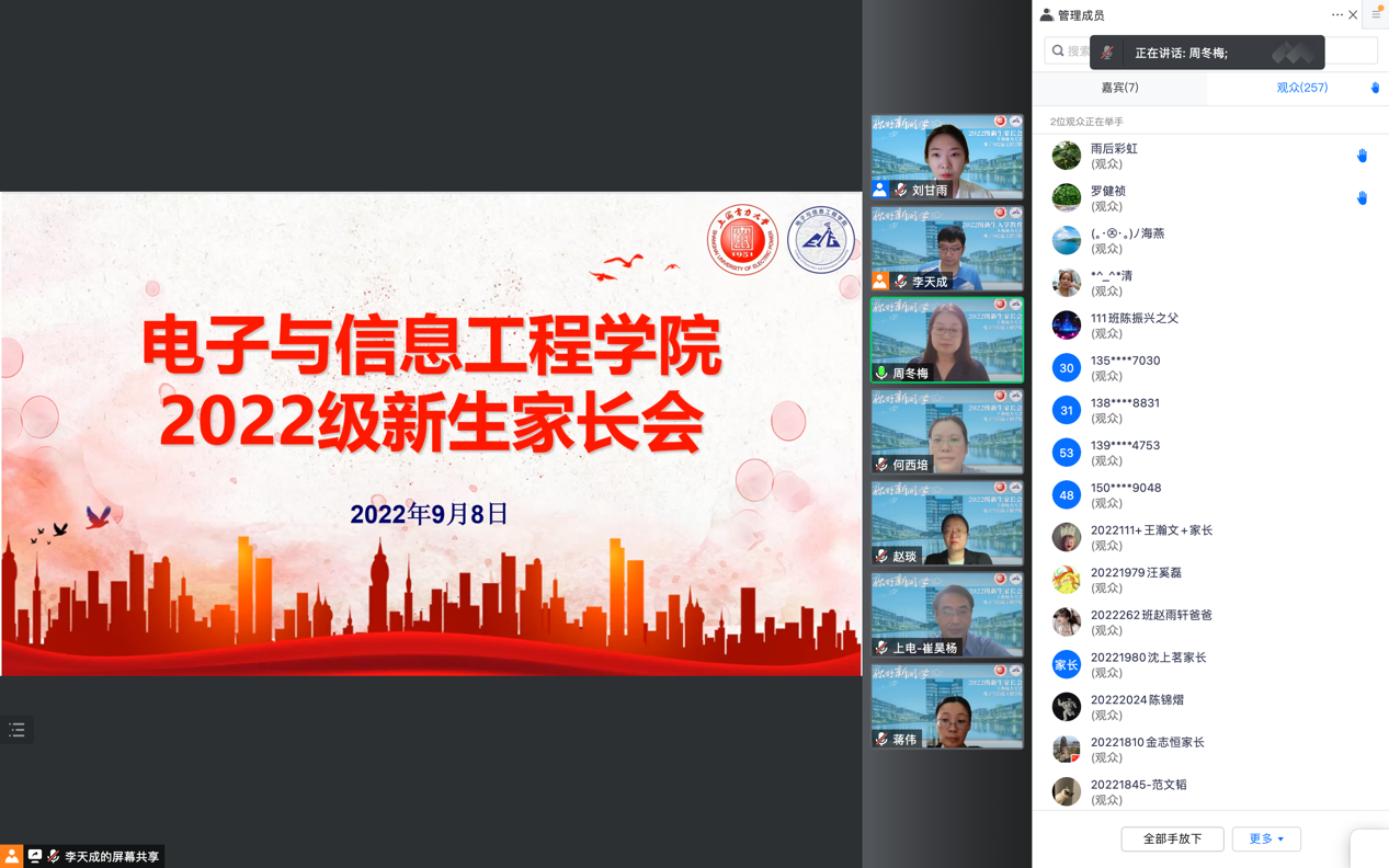 9月8日晚,新葡萄8883官网amg官网召开了全体新生线上家长会,向新生家长们介绍了学校、学院、专业情况、学生学籍管理、考研升学、学生事务管理等工作,帮助新生家长们进一步了解学生进入大学之后的管理体系、学习内容和发展方向,引导新生家长主动关心学生学业规划、心理健康以及环境适应等问题,明确大学阶段家长的职责,增强家校合作,实现家校共育,助力和保障每一位学生成长成才。