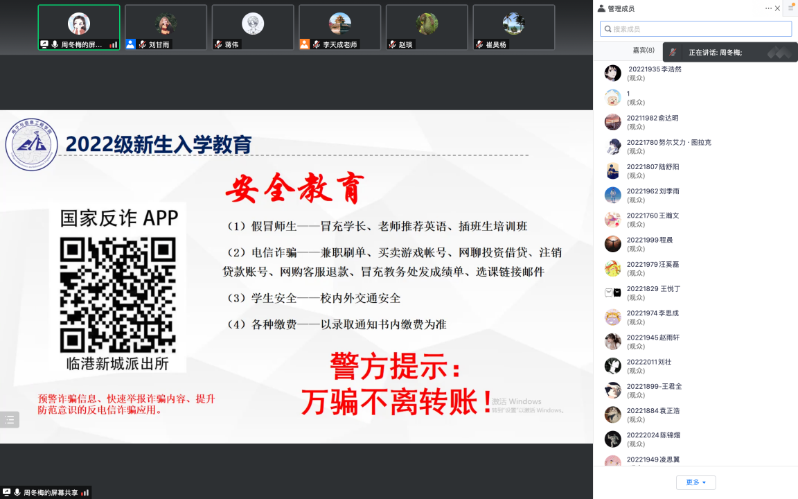 大一新生陈振兴说:“在观看网络安全教育后,我深深地了解了电信网络诈骗的危害,从冒充客服、警局到谎称中奖再到到假借贷款,我们时时都处在骗局的环境中。正值大学期间,我们中有许多人因为社会阅历缺乏,维权观念淡薄,自我保护意识不足等原因使自己的利益蒙受损害。为此,在这个网络的大平台中我们要时时保护个人信息,加强法治观念,树立正确价值观,这样才能为我们充沛的大学时光不留一丝遗憾。”