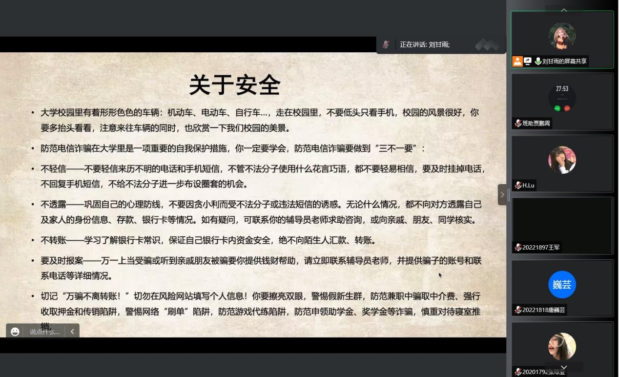学院通过线上班会、新生入学教育大会、家长会的形式讲述网络安全的重要性,各年级辅导员老师结合身边事例,以视频播放、演示文稿讲解等形式,深入浅出地让学生认识网络的利弊,揭露网络违法犯罪伎俩,引导学生了解沉迷网络的害处,提醒学生警惕垃圾网站,拒绝不良诱惑,提高安全防护意识,谨防上当受骗,动员学生积极参与到文明上网、安全上网、适度上网的行动中来;同时,通过中国大学生在线举办的全国大学生网络安全知识答题活动以及学院组织的“全民同心 反诈同行”网络安全和防诈骗知识竞赛活动,让同学们更加明白隐藏在在大学生身边的网络安全陷阱,成为共同守护网络安全工作的青春力量。