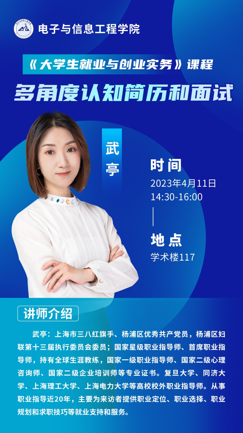 此次课程由我校校外职业指导师武亭主讲。武亭为上海市三八红旗手、杨浦区优秀共产党员,杨浦区妇联第十三届执行委员会委员;国家星级职业指导师、首席职业指导师,持有全球生涯教练,国家一级职业指导师、国家二级心理咨询师、国家二级企业培训师等专业证书。在职业定位、职业选择、职业规划和求职技巧等方面有近20年的指导经验。