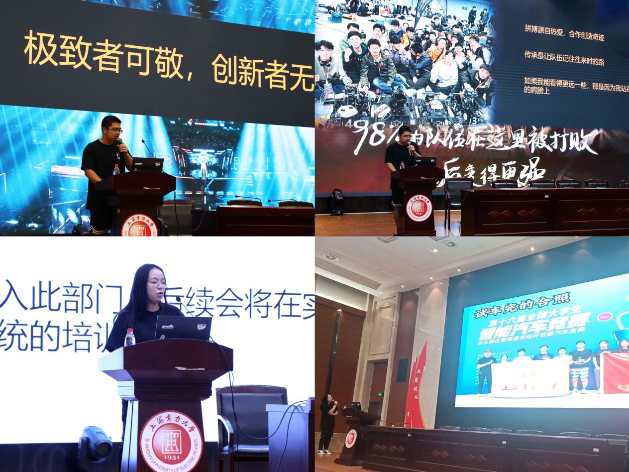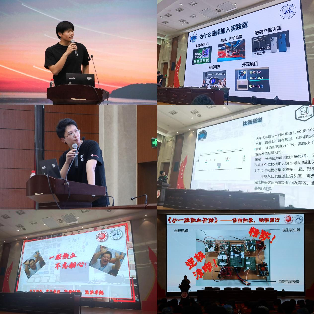 随后五位优秀学生代表从不同的主题出发,主要介绍了关于智能车竞赛和RM中的技术应用和比赛规则流程,分享了比赛中的困难和挑战,包括“负压电磁”“双车接力”“声音信标”“极速越野”以及关于机甲大师的详细规则和视频分享,鼓励新生勇敢面对困难,积极投身科技创新。学长们的故事激励新生不惧挑战、勇于尝试,以积极态度参与科创活动。