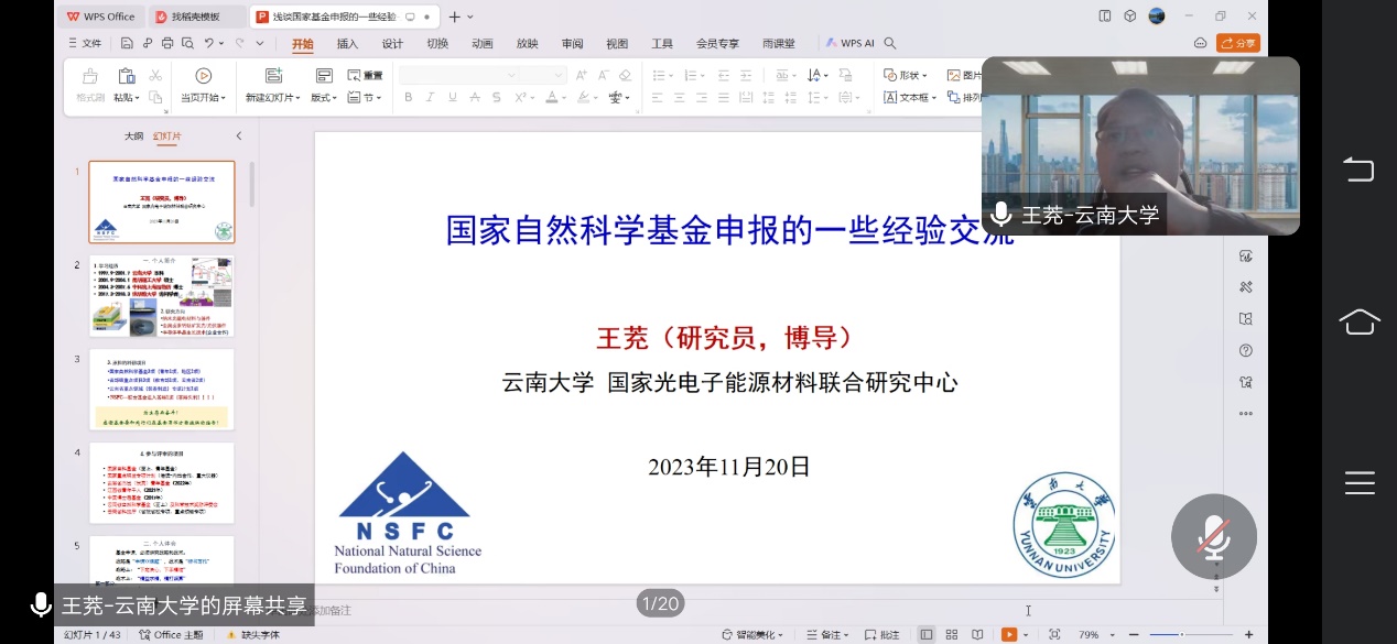 11月20日晚上19:30,新葡萄8883官网amg官网邀请云南大学材料科学与工程学院王茺研究员进行题为“国家自然科学基金申报的一些经验交流”讲座。会议由薛亮副院长主持,使用腾讯会议线上进行,约60余名学院教师及研究生参加了讲座。