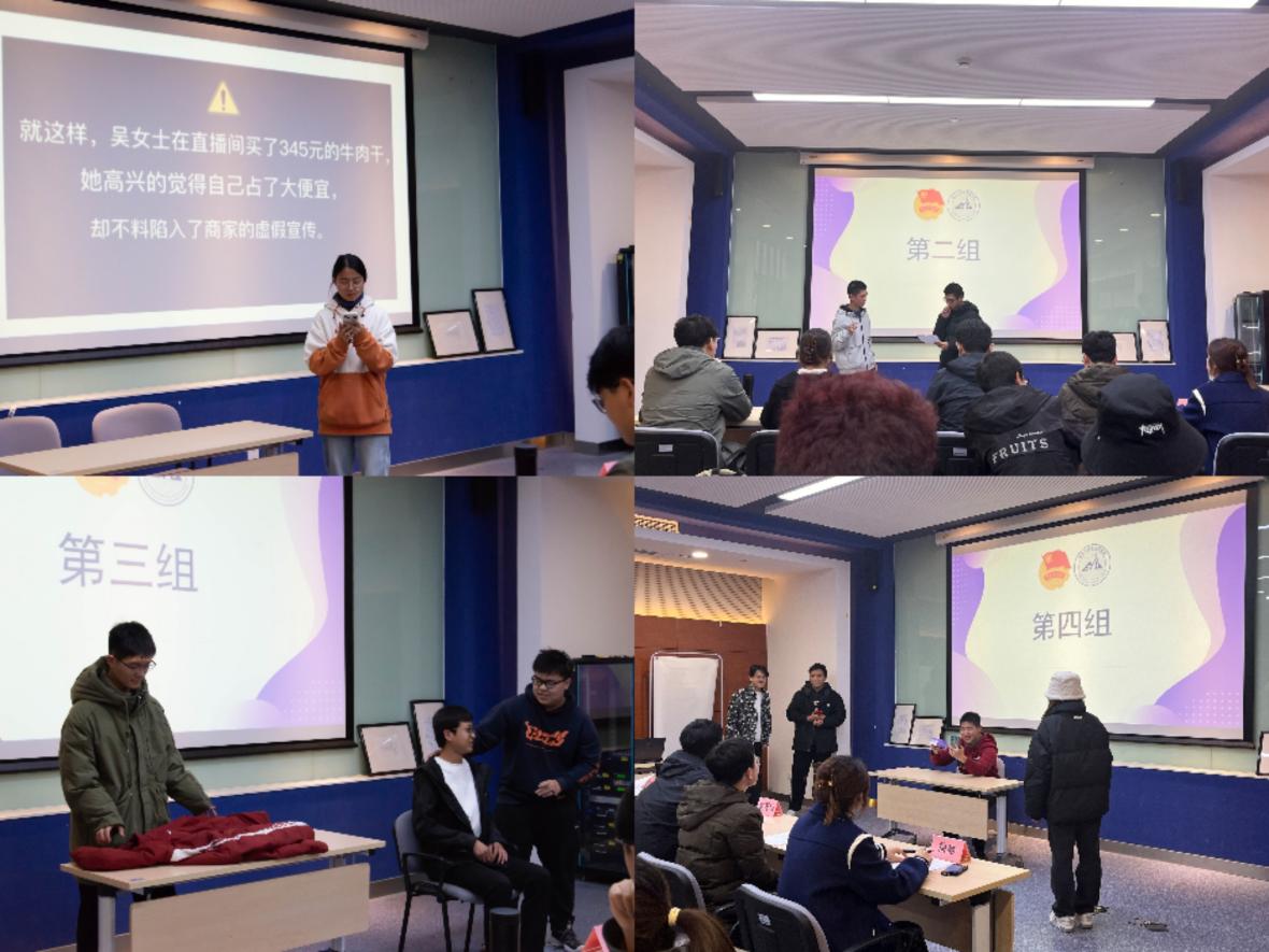本次权益月活动设置了初赛和决赛两个阶段。初赛是“权益知识竞赛”,共40人参与了关于维权方式和途径的题目,通过线上答题的形式进行选拔。进入决赛的同学分为四个小组,以小品节目的形式展示权益保护的内容,参赛选手分别围绕直播带货虚假宣传、不良商家售卖三无产品、理发店强制推销、售卖假牛肉干等经典案例的场景,各组通过精心编排的剧本精彩演绎,运用法律的武器成功地维护自己权益,让观众在笑声中懂得了如何维权,提醒大家提升维权意识。