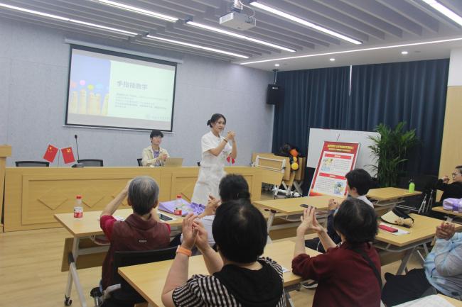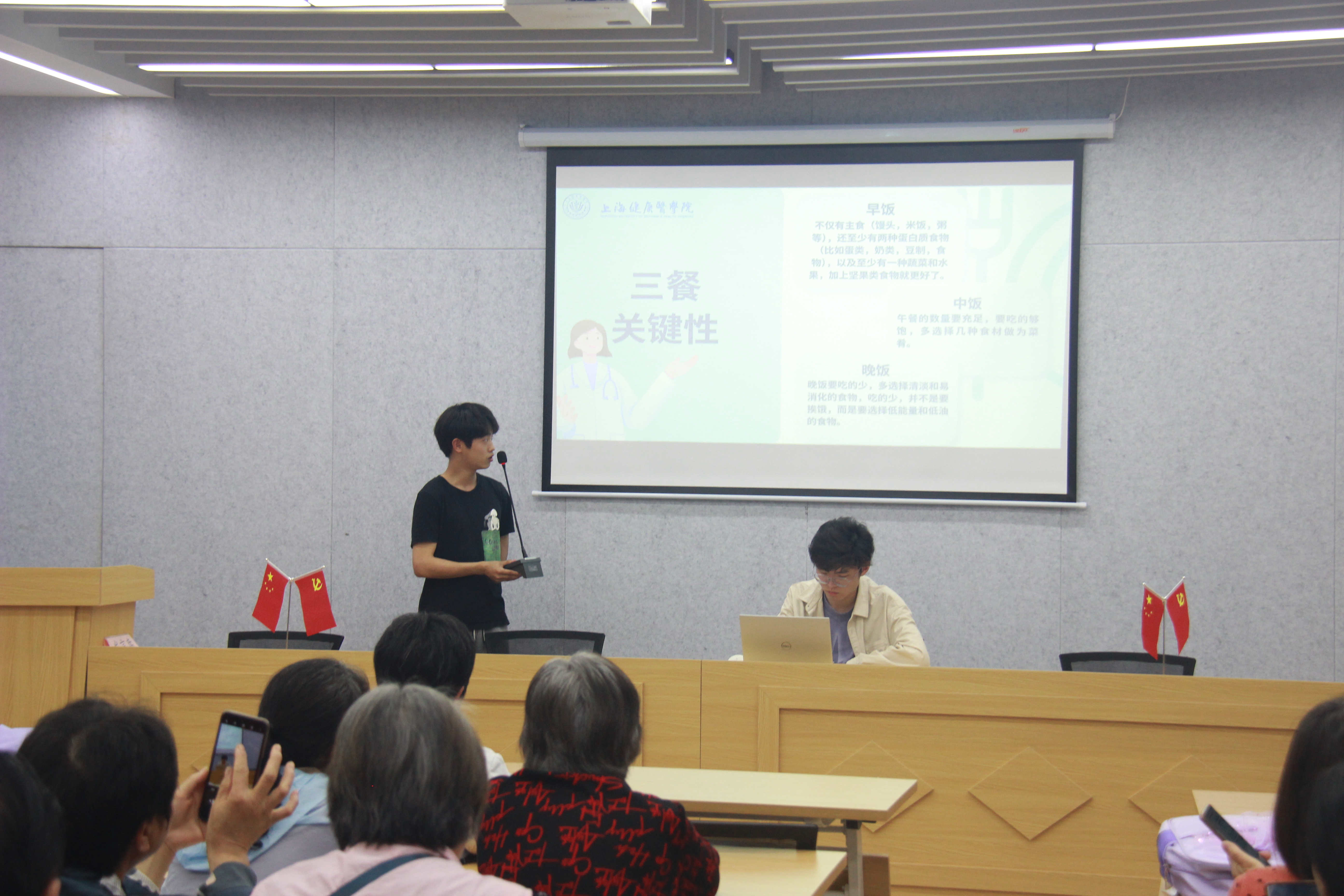 上海健康医学院志愿者以“扬合理饮食,塑科学锻炼”为主题,对如何健康生活进行了介绍,阐述了如何合理平衡膳食,强调规律饮食、活动身体的重要性。随后,志愿者带领社区居民进行手指操练习,讲解了手指操的步骤和作用,进行了健康知识问答等环节,在场社区居民踊跃提问,气氛活跃。